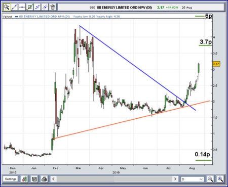 The situation now is of movement above 3.175p mid-price pointing toward 3.75p next with secondary a visually surprising 6p. We're inclined to take this secondary with a pinch of salt as it appears very probable the previous highs just below the 4p level are very liable to provide some stutters in price growth.