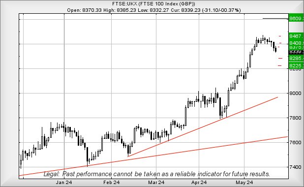 In normal circumstances without the background noise of world events and news of a coming UK election, conventionally we’d be giving 8,408 as an initial target with secondary, if beaten, at 8,467 points, but recently the FTSE 100 has been quite stingy with the width of movements.