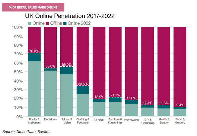 According to GlobalData (chart below), online sales should make up 18.5% of retail sales in the UK in 2022. Certain sectors are more affected than others. Just over 60% of books and stationary sales are made online, forecast to rise to 70% in 2022, while half of electricals are sold online, to rise to 53%. Food and grocery sales are largely physical affairs, however, and only 9.4% are forecast to be made online by 2022.