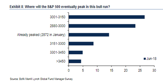 Bullish sentiment can also be seen in predictions for the S&P 500 index. Roughly half of investors surveyed believe the index will peak past 3,000 points, with 25% of the total surveyed predicting a peak at somewhere between 3001 and 3150. On 11 June 2018, the index closed at 2,782.