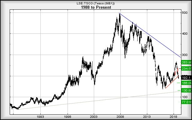When we review price performance since the Brexit vote, Tesco share has broken trend and currently languishes in a zone where a visit to 166p next makes some sense. If broken, it should bottom around the 130p mark eventually which is rather distressingly below the level when the current ruling trend started. (Red on the chart)